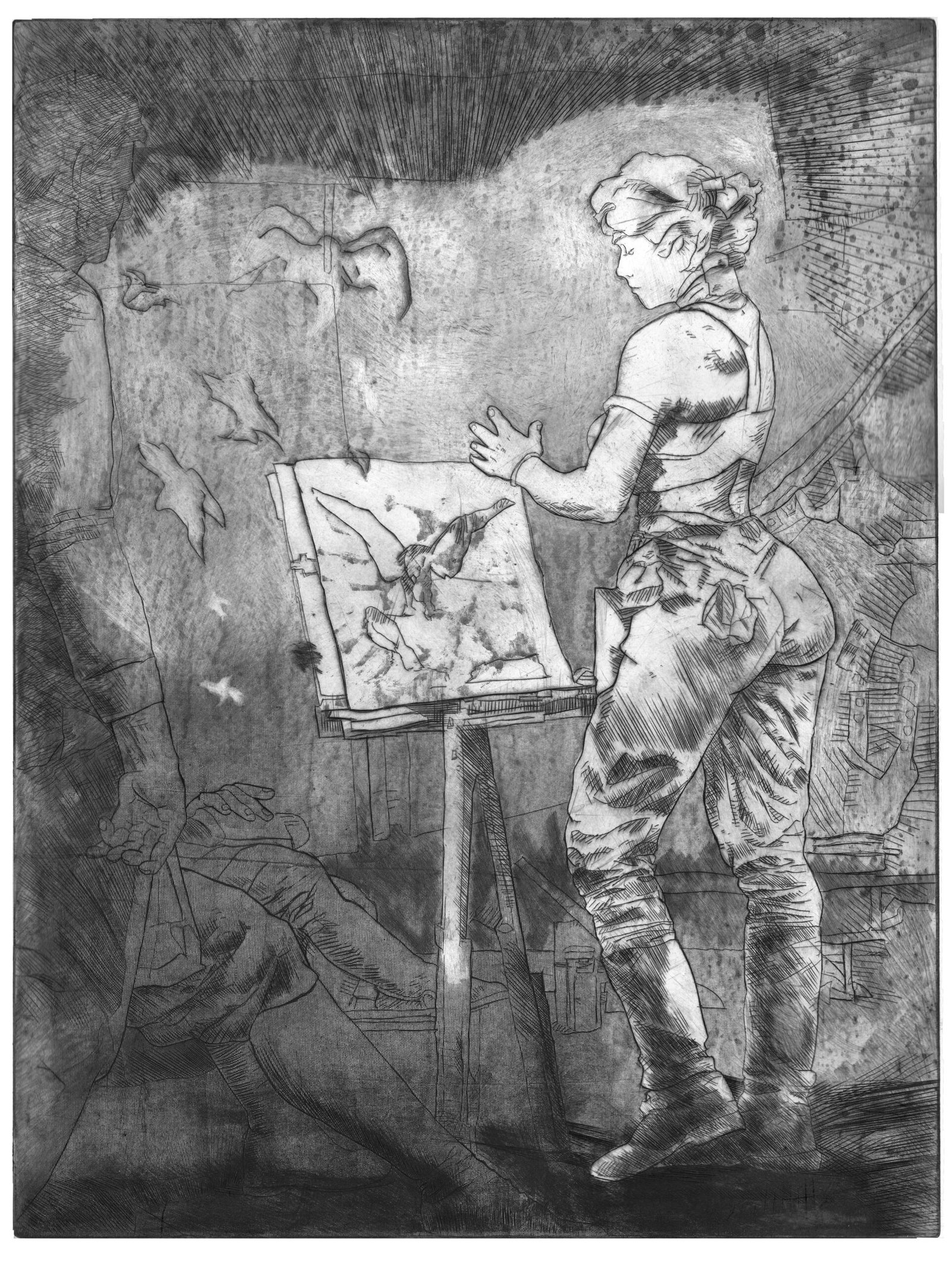 This is a remembrance of the lost female presence in the life of a man. It is 18×24 inches on copper. Engraving, softground, and drypoint. This edition is 100. 50 of them are in Charbonnel bistre ink, while the others are in black ink. This product is the black option.